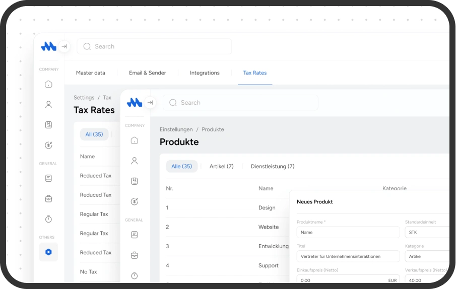 Produkte und Services zentral verwalten – mit Preisen, Einheiten und Steuern für eine schnelle Angebots- und Rechnungsstellung.