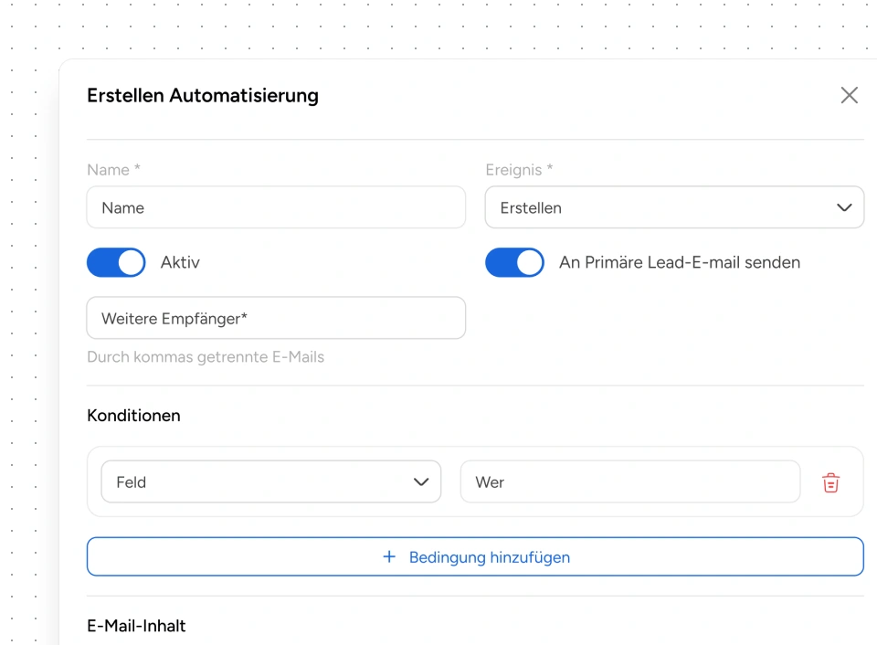 Mit Automatisierungen legst du Regeln für wiederkehrende Abläufe fest. Dazu gehören Lead-Follow-ups per E-Mail, wiederkehrende Rechnungen oder zeitgesteuerte Aktionen, die dir manuelle Arbeit abnehmen und Prozesse verlässlicher machen.