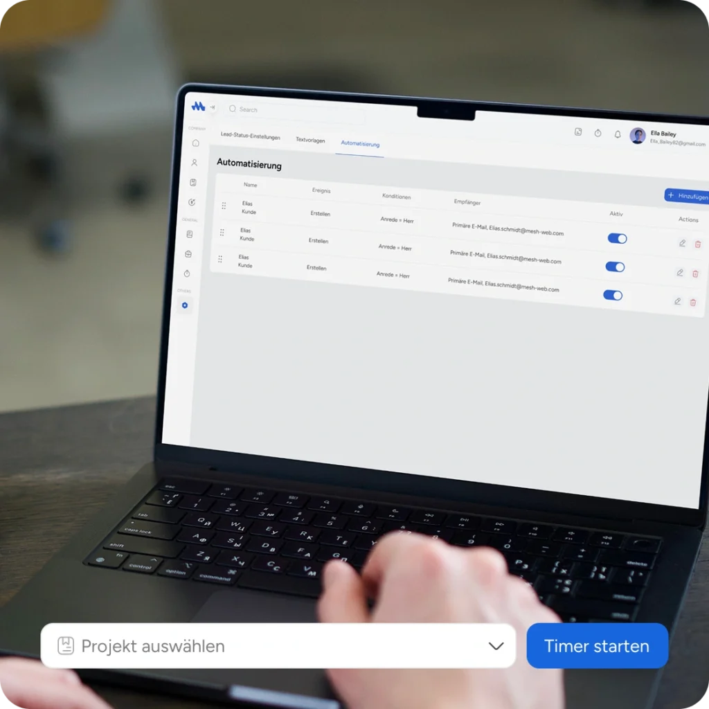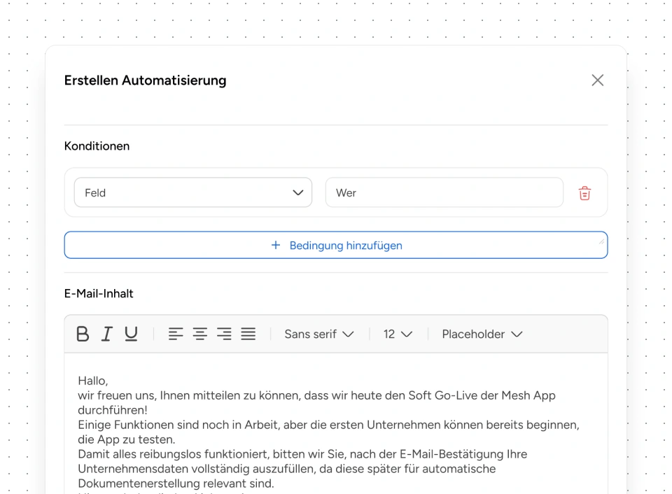 Automatisiere Abläufe und erweitere Mesh App nach deinen Bedürfnissen. Leads lassen sich per E-Mail automatisch begleiten, mit frei definierbaren Intervallen. Wiederkehrende Rechnungen werden automatisiert erstellt und vom System in vom Nutzer festgelegten Abständen selbstständig versendet. Mit benutzerdefinierten Elementen passt du Felder, Buttons und Abläufe flexibel an.