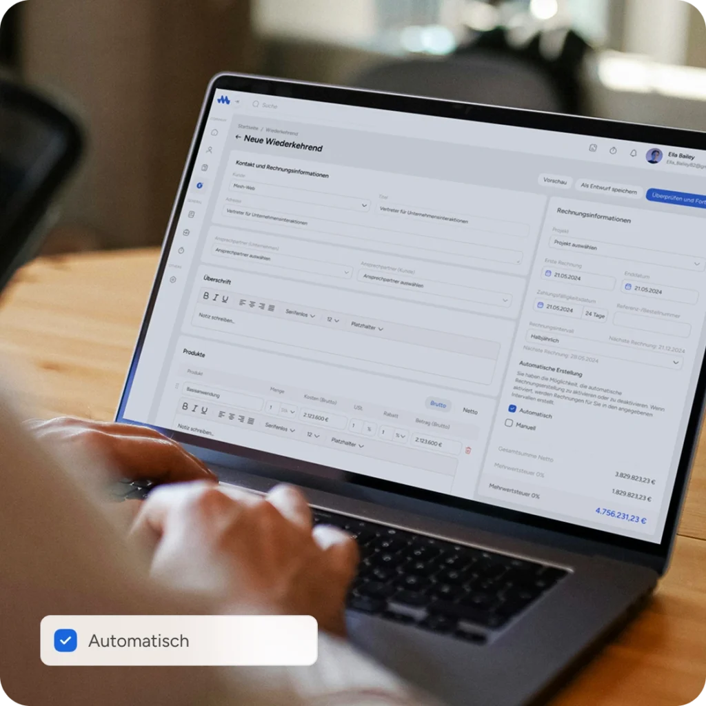 Spare Zeit und reduziere manuellen Aufwand mit wiederkehrenden Rechnungen. In der Mesh App kannst du mit der Funktion für wiederkehrende Rechnungen eine Rechnung einmal erstellen und das gewünschte Intervall festlegen. Das System erstellt die Rechnung automatisch und sendet sie pünktlich per E-Mail an den Kunden.