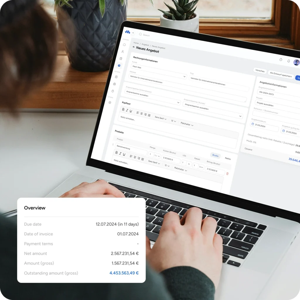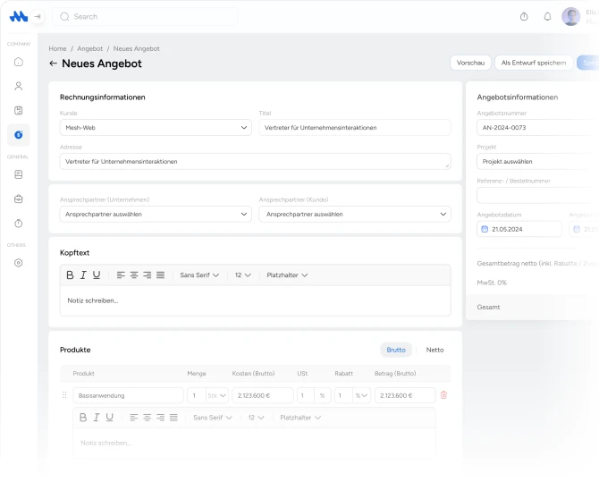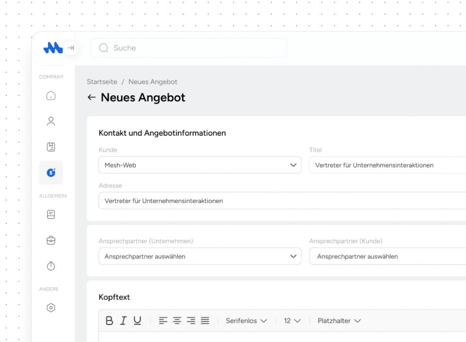 Mit der Mesh App kann man Angebote direkt erstellen und versenden, den Status auf versendet, akzeptiert oder abgelehnt setzen und bestätigte Angebote ohne Aufwand in Rechnungen umwandeln. So bleibt jeder Schritt übersichtlich und kontrollierbar.