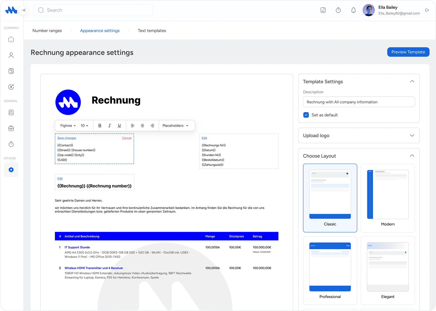 Passe das Design deiner Rechnungen vollständig an dein Firmenbranding an. Lege Farben, Logo und Schrift fest und definiere alle relevanten Unternehmensdaten wie Adresse, Steuernummer und Zahlungsinformationen. So wirken deine Rechnungen professionell, konsistent und stärken den Wiedererkennungswert deiner Marke bei jedem Versand.