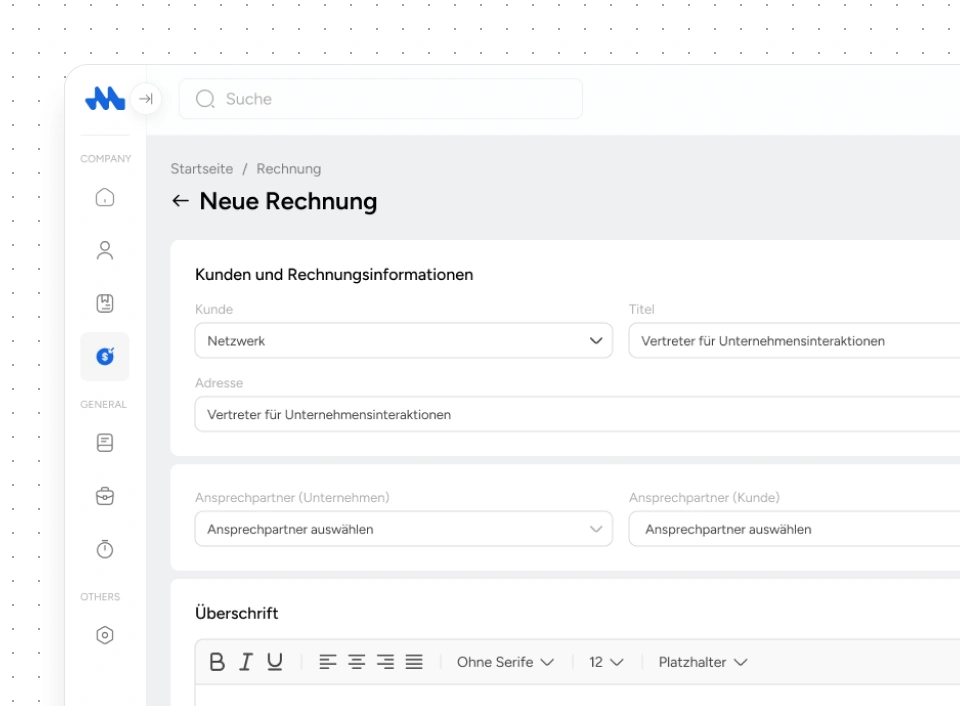 Erstelle Rechnungen in einem modernen und klaren Interface, das dich Schritt für Schritt führt und alle wichtigen Felder logisch und übersichtlich darstellt.