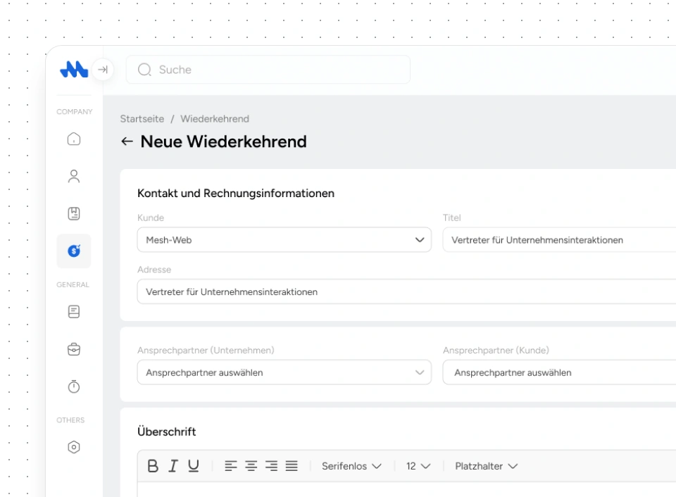 Keine Lust, jeden Monat die gleichen Rechnungen neu zu erstellen? Mit der Funktion für wiederkehrende Rechnungen in der Mesh App werden regelmäßige Rechnungen automatisch erstellt und zuverlässig abgewickelt, ohne manuellen Aufwand.
