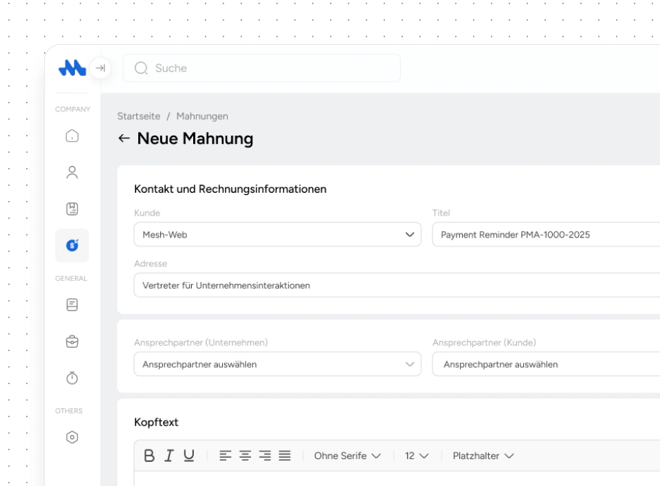 Mit der Mesh App kann man auch Mahnungen direkt erstellen und verschicken. Offene Rechnungen lassen sich übersichtlich nachverfolgen, sodass Zahlungserinnerungen rechtzeitig und ohne zusätzlichen Aufwand versendet werden können.