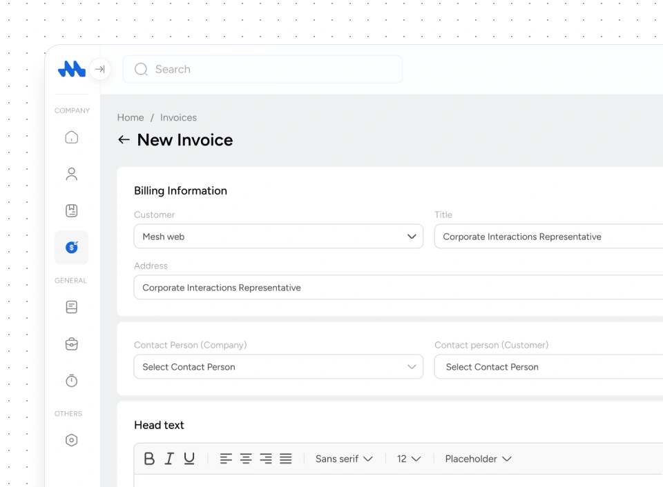 Erstelle, verwalte und versende Rechnungen mühelos. Markiere Zahlungen, klone Vorlagen und behalte jederzeit den Überblick. Mit der Mesh App wird Rechnungsstellung klar, schnell und zuverlässig.