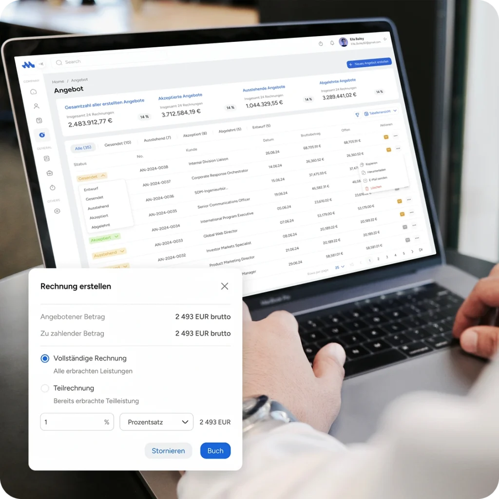 Akzeptierte Angebote lassen sich direkt in Auftragsbestätigungen und Rechnungen umwandeln, ohne Daten erneut eingeben zu müssen.